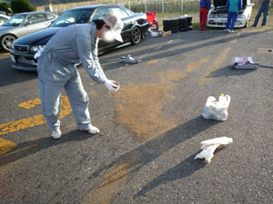 参加者の方にオイル吸収材を頂きオイル処分中。