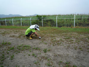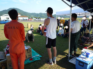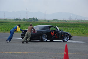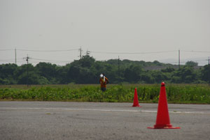 スタッフが暑いアスファルトに寝そべってパイロン救出中。