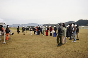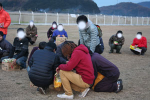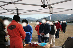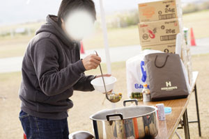持ち帰った豚汁と自前の弁当で昼食をとる岡大自動車部。