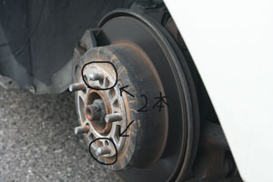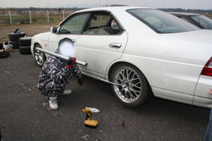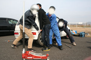 タイヤ交換というので、冗談で人力ジャッキアップを強要。