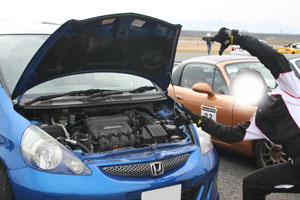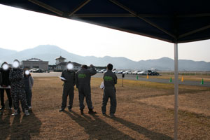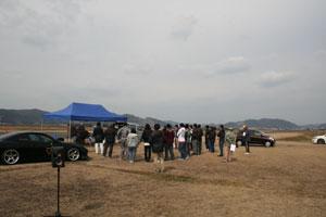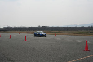 ドリフトとグリップで2台試走し、パイロンの間隔をチェック。