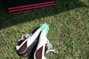 ガムテープで修復中の運動靴。