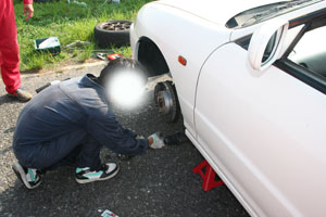 マエポンがタイヤ交換をしている・・・半ケツ丸出しで!