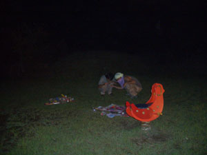 缶を半分に切り炭を入れ、蝋燭代わりに置いてました。