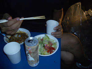 彼は面白いことに肉のタレを紙コップに入れてました。